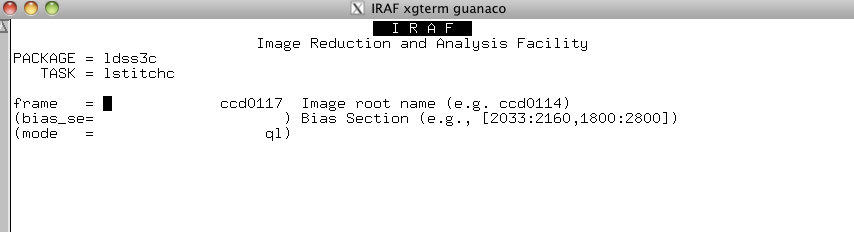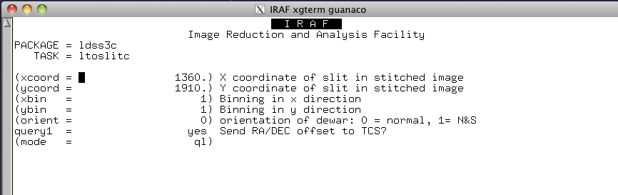 The afternoon is also a good time to start IRAF on the observer workstation (using the link in the menu bar) and load the LDSS3 packages by typing "ldss3" at the 'cl>' prompt. Take some time to familiarize yourself with the LDSS3 packages, in particular "lstitch" is useful for all observing modes as a means to stitch together the two FITS files that result from a standard readout of the dual-amp CCD. The resultant stitched image will display the full CCD in the orientation matching that of the LDSS3 quick look tool.