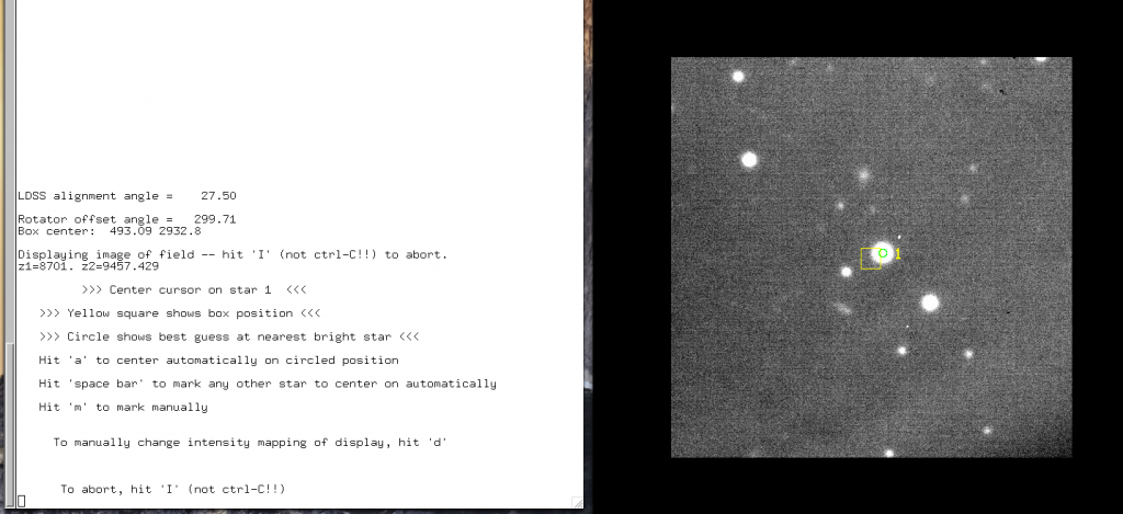 Now run “lalign". One by one, the expected position of the reference stars will be displayed in the "ds9" tool, and you will be asked to mark the star. Use the "space bar" to calculate the centroid, or use the "m" key to mark the position manually. If you wish to change the minimum and maximum data values mapped into ds9, hit the "d" key. If you wish to abort, hit the "I" key (do not try to abort using Ctr+c). Usually the software will suggest the brightest star close to the slit as the reference star (green circle in Fig. ?). If this is not the star you have actually used (a finding chart could be useful in this step), mark the correct star either using “space bar”, if it is bright enough, or “m”, if it is not clearly visible and you need to centre it manually. Once you've marked each of the reference stars, a solution is calculated and you will be offered the chance to eliminate discrepant stars. A final solution for both a rotation offset and an offset in RA and DEC is then calculated, and you will be asked if you wish to apply these offsets. Usually it is o.k. to reply "yes". Make sure you also reply "yes" to the question of whether you want to do a coordinated offset (which moves both the telescope and the guide probes), but let the TO know before actually executing it.