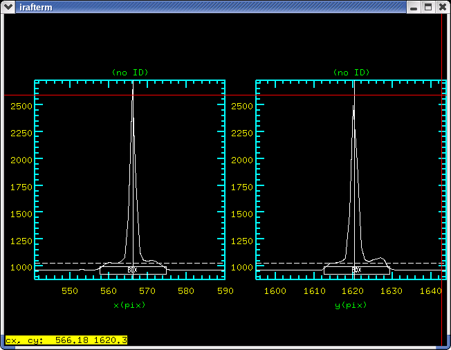 The "lfalign" task will step through each of the alignment stars showing you x and y cuts looking something like the plots in Fig. 7. The dashed line in these plots shows the level determined for the sky. The rectangle shows the position measured for the alignment box, and the solid line displays the calculated centroid of the star. You can change any of these values (type "?" to see how to change them), but usually this is totally unnecessary. Once you are happy with the xy fits, type "q" to move on to the next alignment star. After marking all the stars, you will be offered the opportunity again to eliminate discrepant stars. Finally, new offsets are calculated and you are asked whether or not you wish to execute them. These offsets should be small, but it is usually worth executing them.