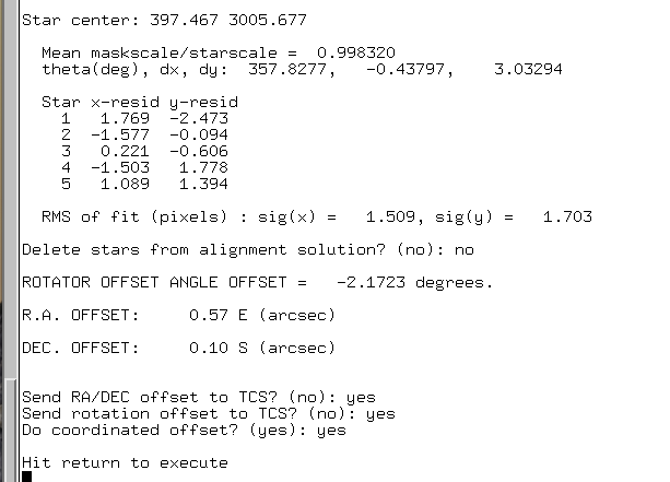 If the offsets are large (>5”), it is advisable to take a new image of your field and repeat the “lalign” procedure on this new image. If the offsets result to a 90degree rotation, then verify that the orientation of the dewar is set properly.