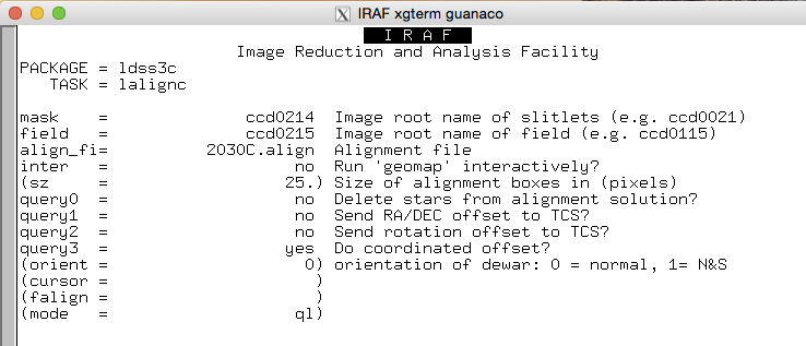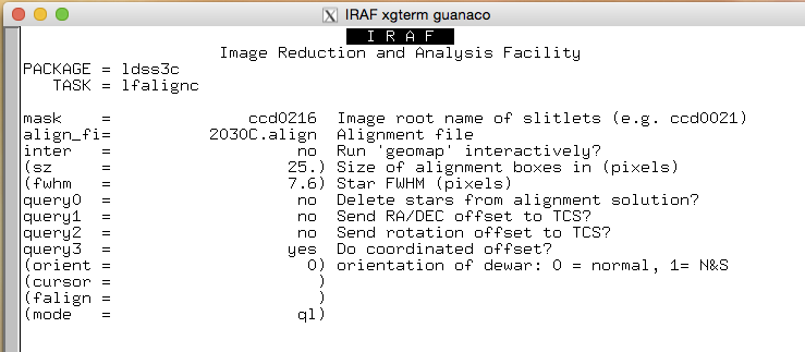 Edit the parameters of the IRAF ldss3 task "lalign". Set the "mask" parameter to the root name of the mask image taken earlier in the night; the "field" parameters should be set to the root name of the field image just taken. Set the "align_file" parameter to the name of the .align file that you produced in that afternoon. The "inter" parameter is normally set to "no", but if you wish to interact with the alignment solution (which is performed with the iraf task "geomap"), set this parameter to “yes". Set the size of the alignment boxes in pixels as measured in the mask image taken earlier. Make sure that the orientation of the dewar corresponds to the current status: 0 for normal operations and 1 for Nod & Shuffle mode.