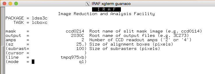 Open an IRAF xgterm and the ds9 image display tool, and type "ldss3" at the CL prompt to load the LDSS3 packages. To edit the parameters of the "lcbox" task, type "epar lcbox". These are as follows: