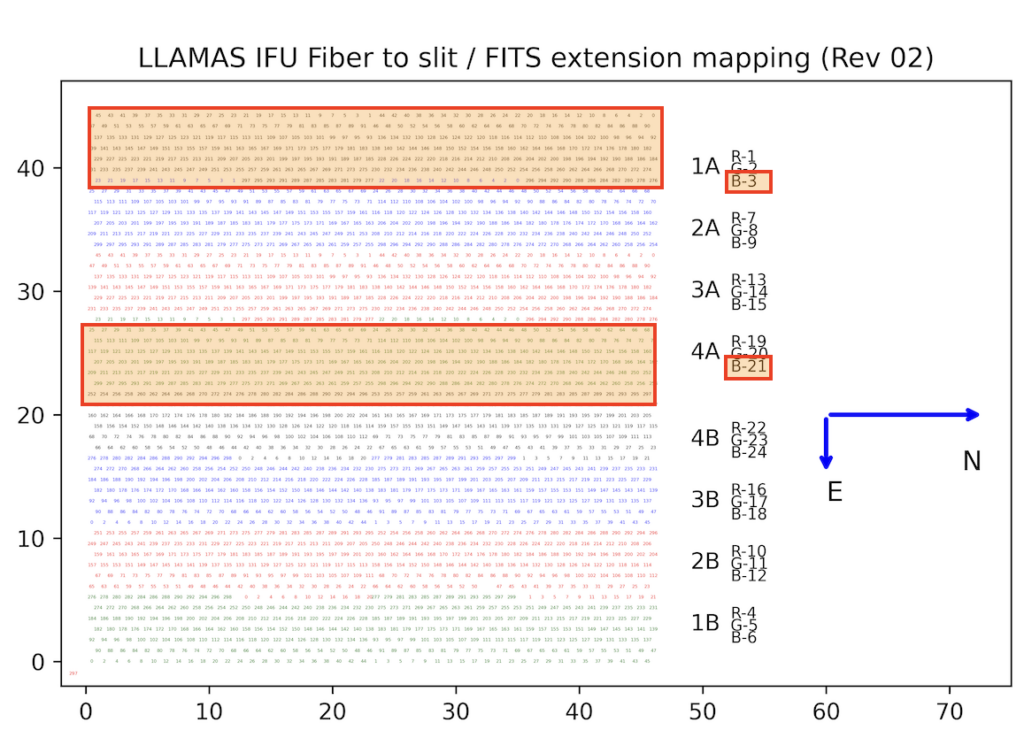 LLAMAS FITS extension layout showing missing Blue channels in 1A (ext. 3) and 4A (ext. 21).